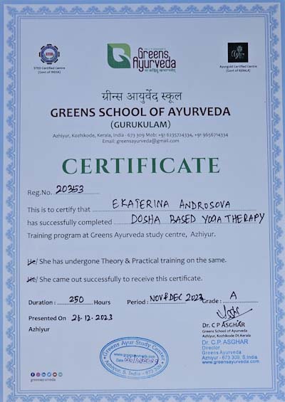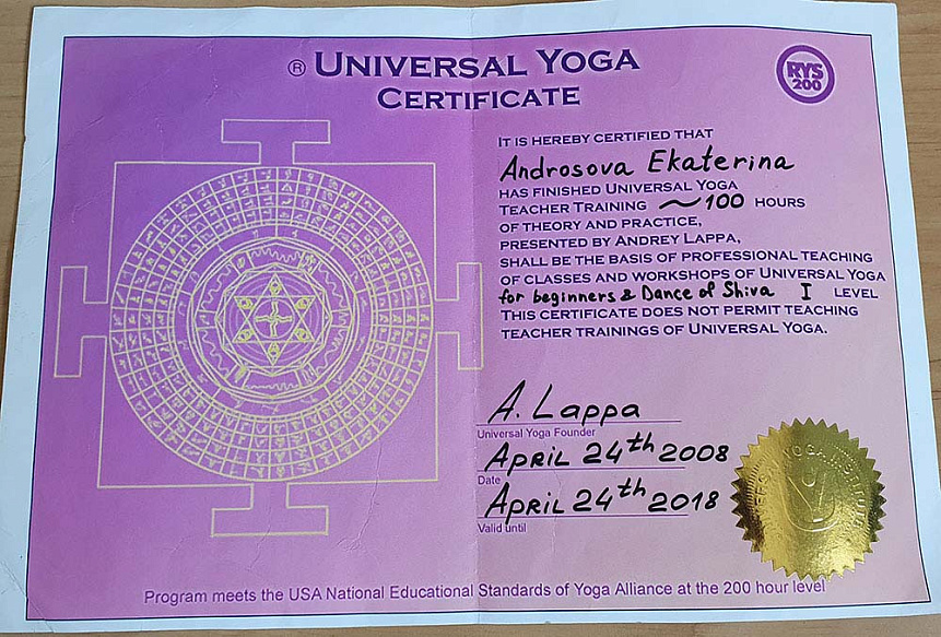 2008: certification course in Universal Yoga by Andrey Lappa.